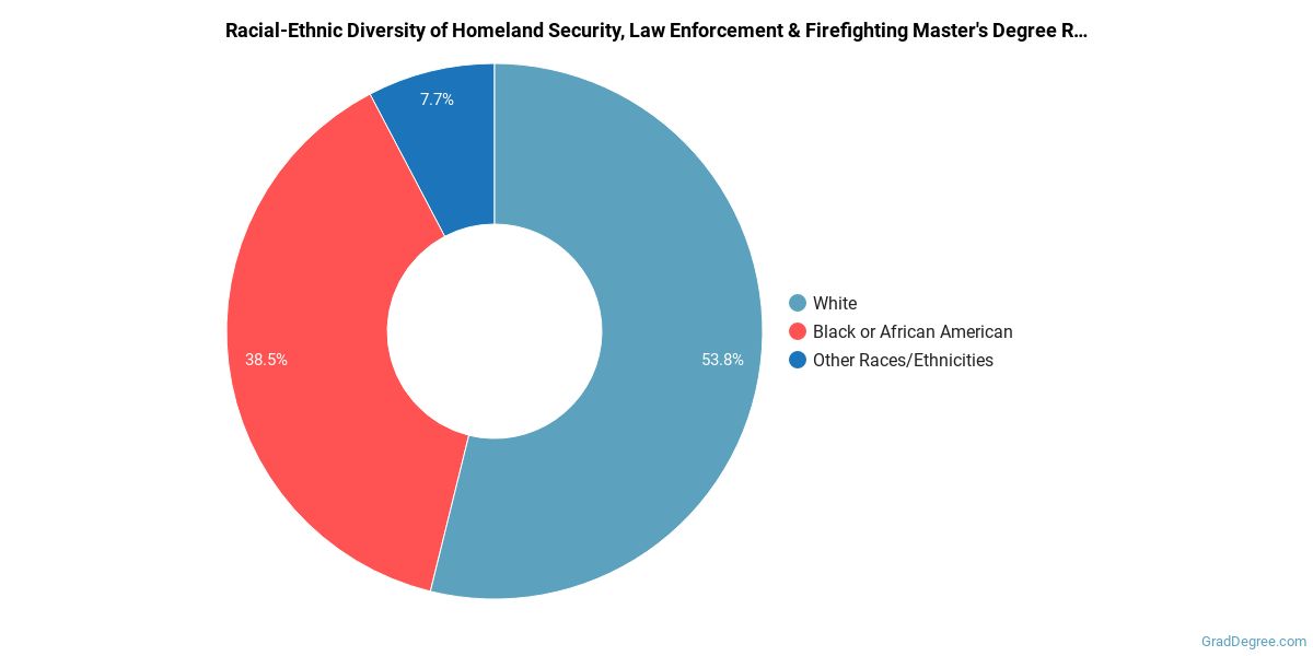 Of the students who received a homeland security, law enforcement and firefighting master's degree from Pfeiffer University, 54% were white. This is typical for this degree on the natiowide level. In the homeland security, law enforcement and firefighting master's program at this school, racial-ethnic minorities make up 46% of degree recipients. That is 6% better than the national average.*