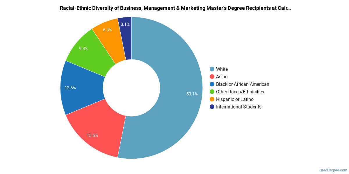 Of the students who received a business, management and marketing master's degree from Cairn, 53% were white. This is above average for this degree on the natiowide level. In the business, management and marketing master's program at this school, racial-ethnic minorities make up 38% of degree recipients. That is 6% better than the national average.*