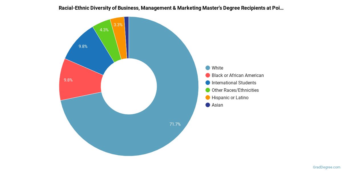 Of the students who received a business, management and marketing master's degree from Point Park, 72% were white. This is above average for this degree on the natiowide level.