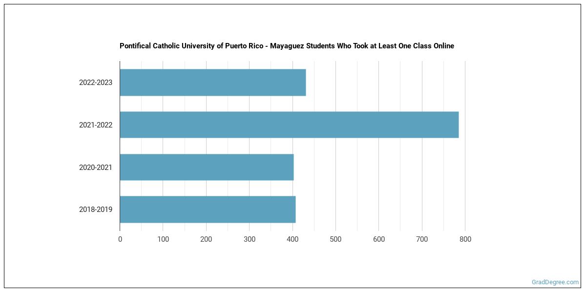 The following chart shows how the online learning population at Pontifical Catholic University of Puerto Rico - Mayaguez has changed over the last few years.