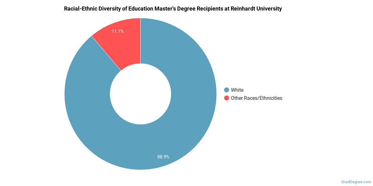Of the students who received a education master's degree from Reinhardt University, 89% were white. This is above average for this degree on the natiowide level.