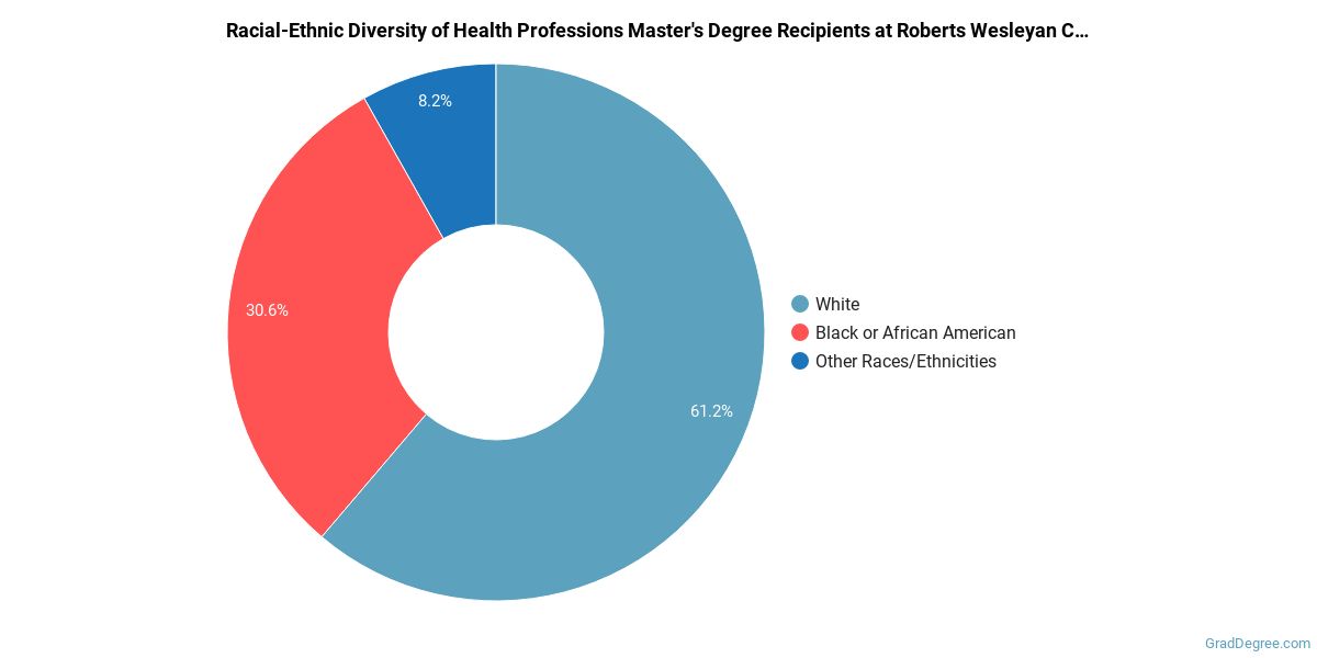 Of the students who received a health professions master's degree from Roberts Wesleyan, 61% were white. This is above average for this degree on the natiowide level. In the health professions master's program at this school, racial-ethnic minorities make up 37% of degree recipients. That is 1% better than the national average.*