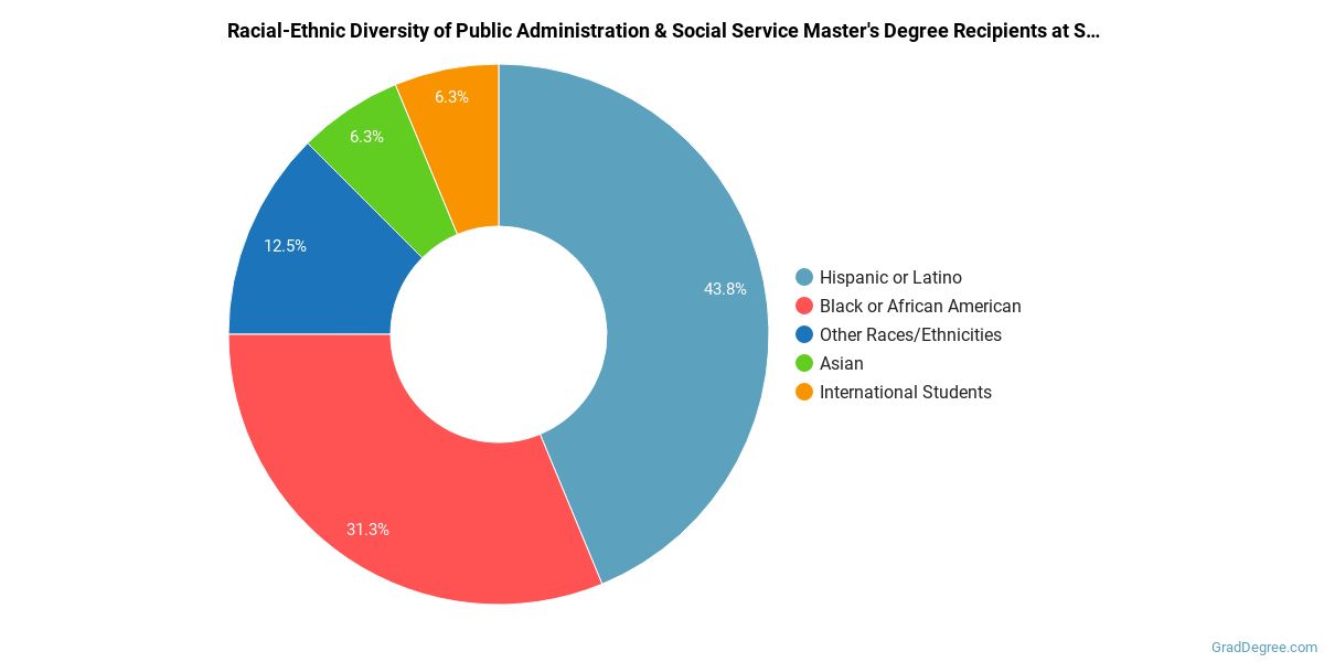 In the public administration and social service master's program at this school, racial-ethnic minorities make up 81% of degree recipients. That is 39% better than the national average.*