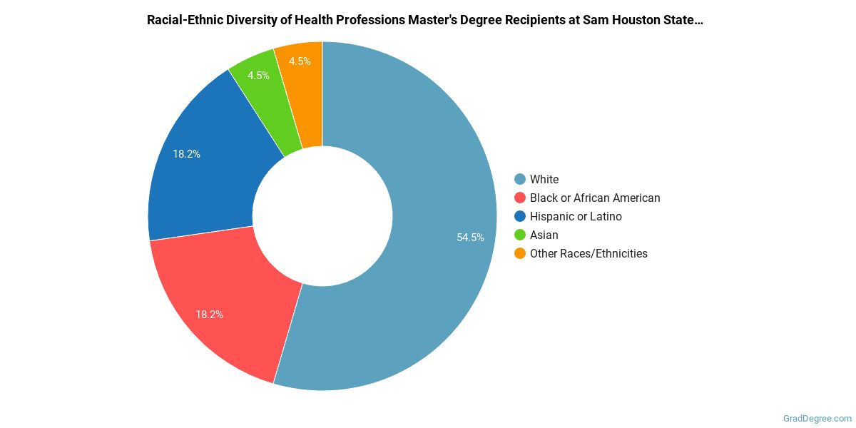Of the students who received a health professions master's degree from SHSU, 55% were white. This is typical for this degree on the natiowide level. In the health professions master's program at this school, racial-ethnic minorities make up 41% of degree recipients. That is 6% better than the national average.*