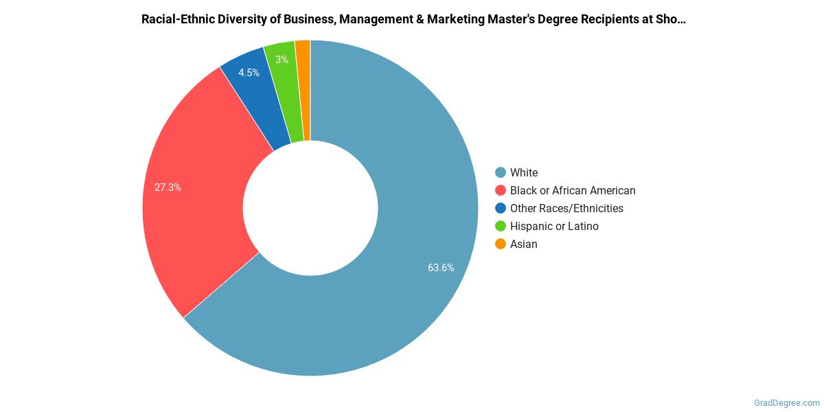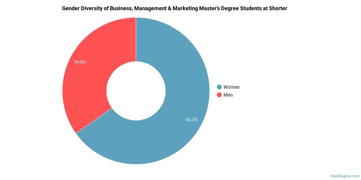 Of the students who received a business, management and marketing master's degree from Shorter, 64% were white. This is above average for this degree on the natiowide level.