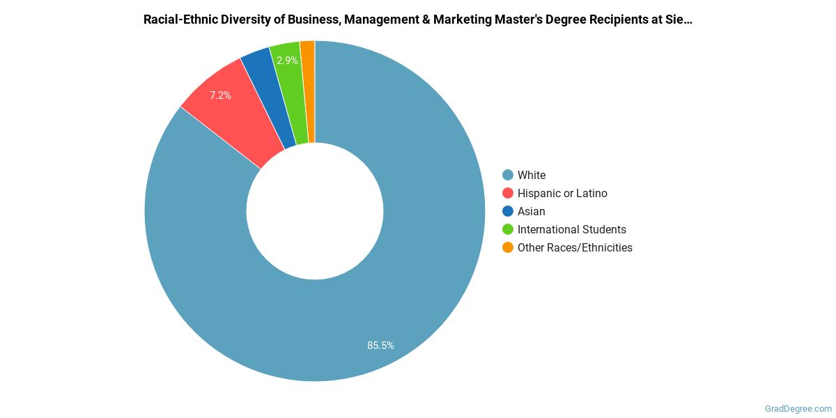 Of the students who received a business, management and marketing master's degree from Siena, 86% were white. This is above average for this degree on the natiowide level.