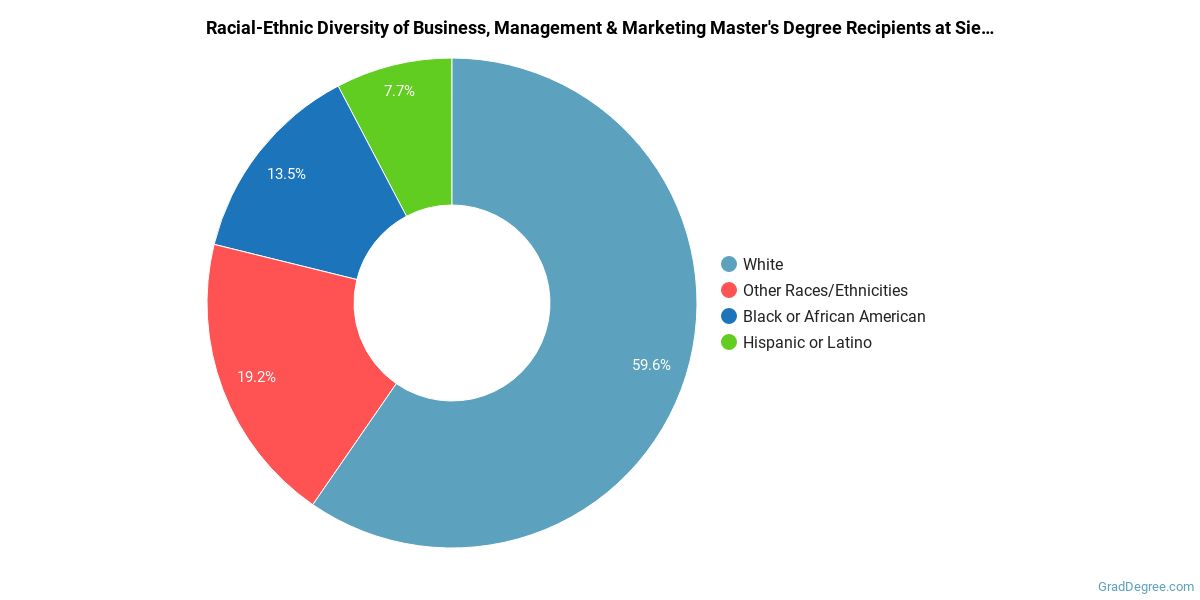 Of the students who received a business, management and marketing master's degree from Siena Heights University, 60% were white. This is above average for this degree on the natiowide level.