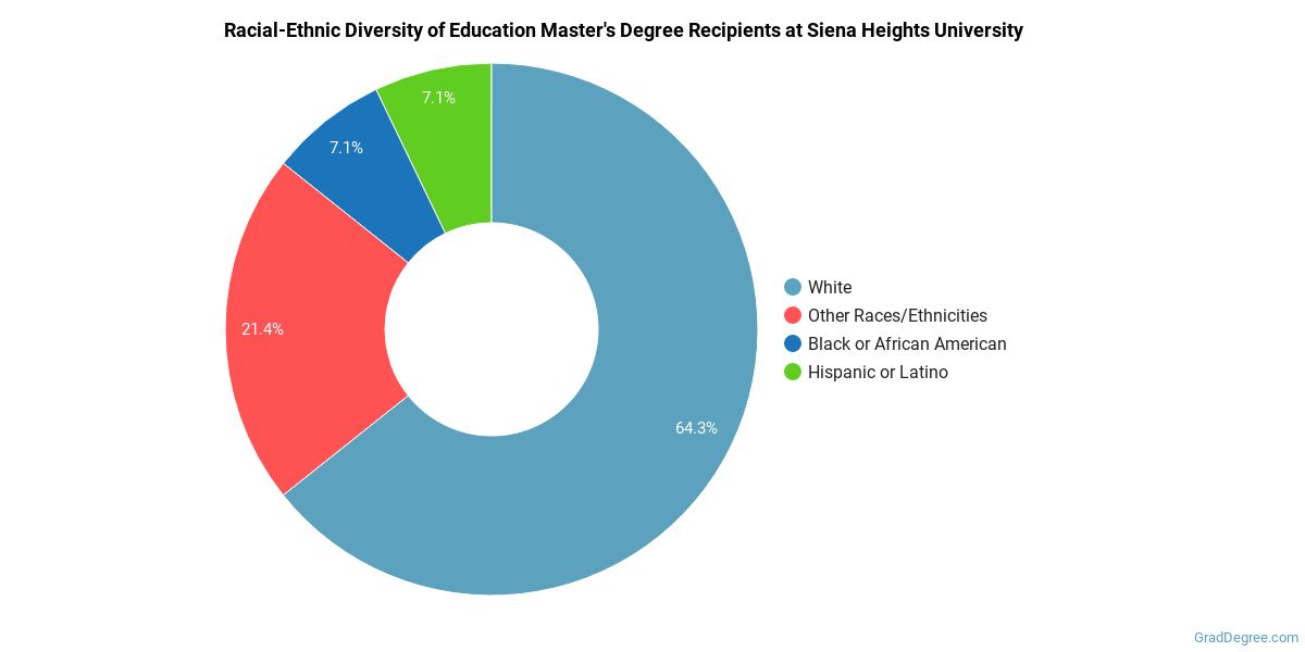 Of the students who received a education master's degree from Siena Heights University, 64% were white. This is typical for this degree on the natiowide level.
