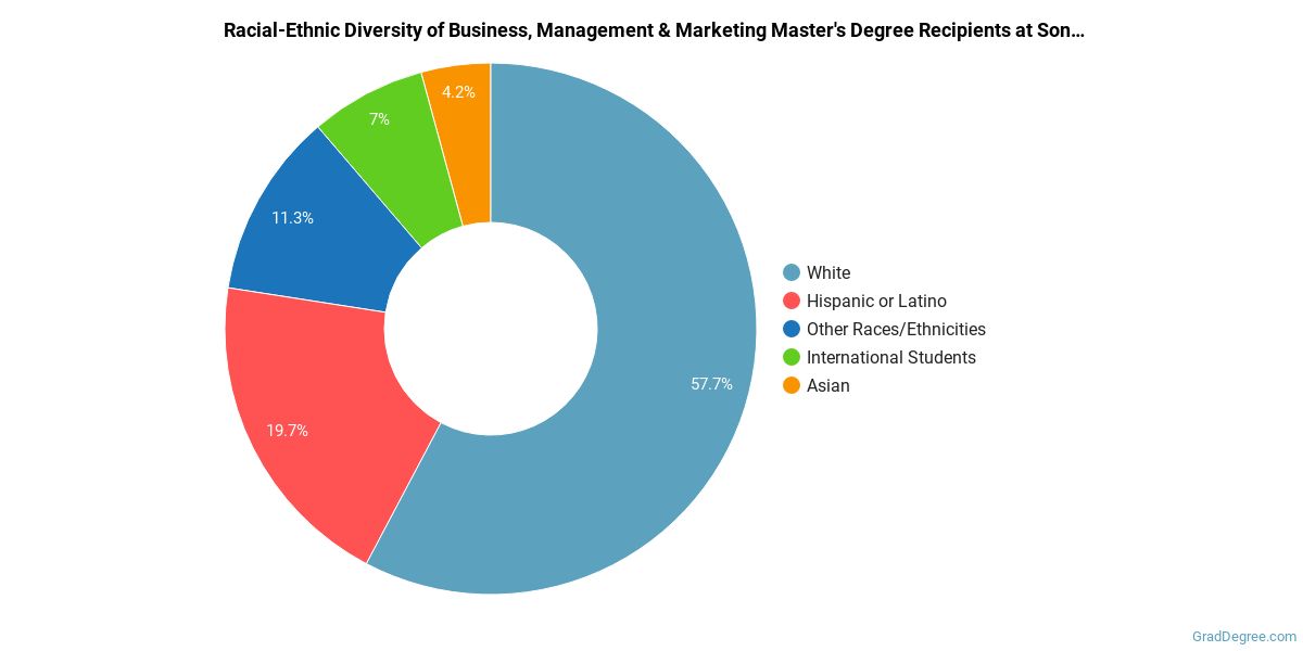 Of the students who received a business, management and marketing master's degree from SSU, 58% were white. This is above average for this degree on the natiowide level.