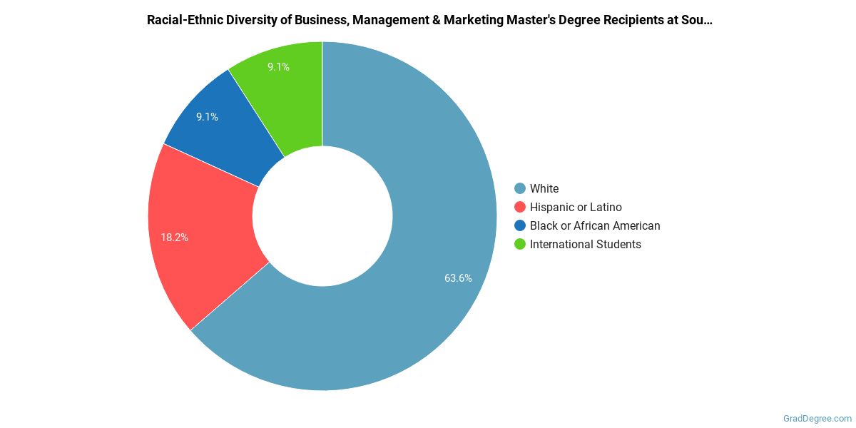 Of the students who received a business, management and marketing master's degree from Southern Adventist, 64% were white. This is above average for this degree on the natiowide level.