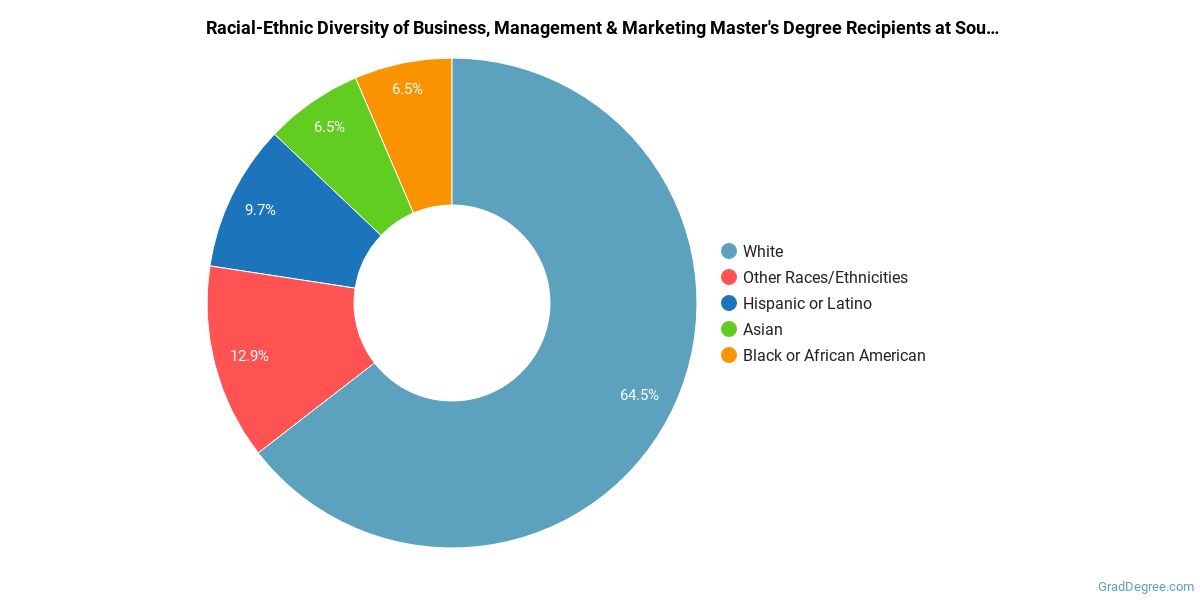 Of the students who received a business, management and marketing master's degree from Southwestern Assemblies of God University, 65% were white. This is above average for this degree on the natiowide level. In the business, management and marketing master's program at this school, racial-ethnic minorities make up 35% of degree recipients. That is 4% better than the national average.*