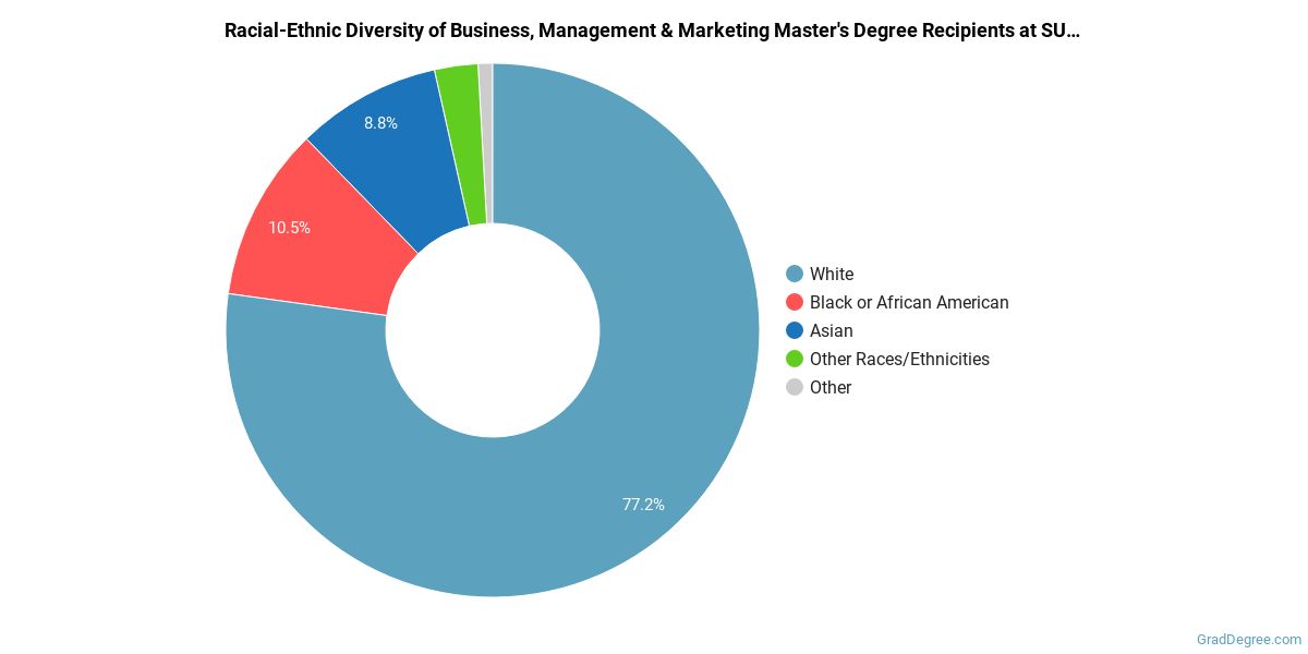 Of the students who received a business, management and marketing master's degree from SUNY Oswego, 77% were white. This is above average for this degree on the natiowide level.