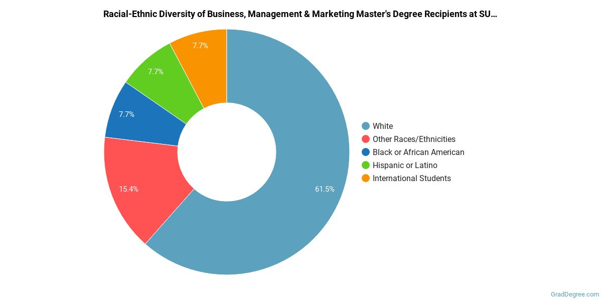 Of the students who received a business, management and marketing master's degree from SUNY Potsdam, 62% were white. This is above average for this degree on the natiowide level.