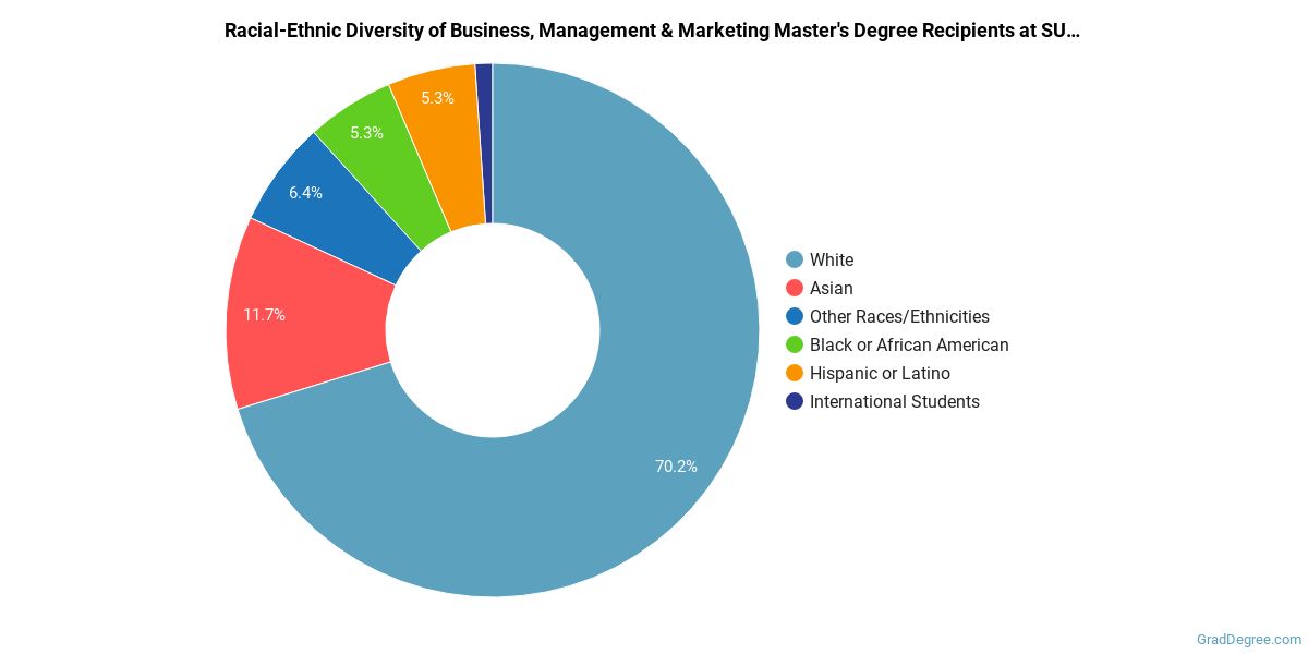 Of the students who received a business, management and marketing master's degree from SUNY Poly, 70% were white. This is above average for this degree on the natiowide level.