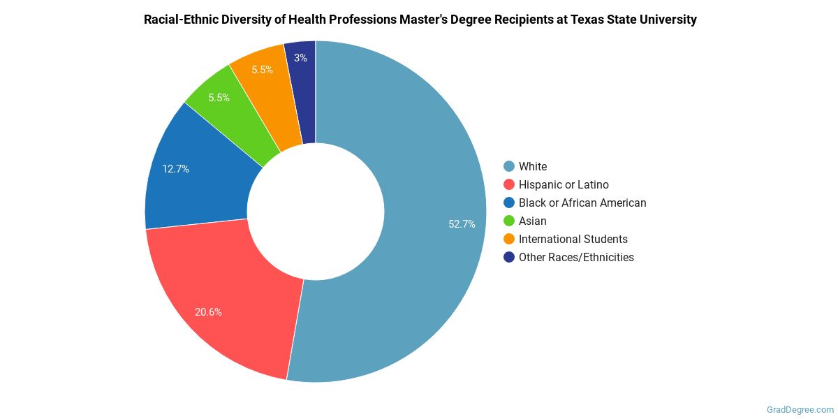 Of the students who received a health professions master's degree from Texas State, 53% were white. This is typical for this degree on the natiowide level. In the health professions master's program at this school, racial-ethnic minorities make up 41% of degree recipients. That is 6% better than the national average.*