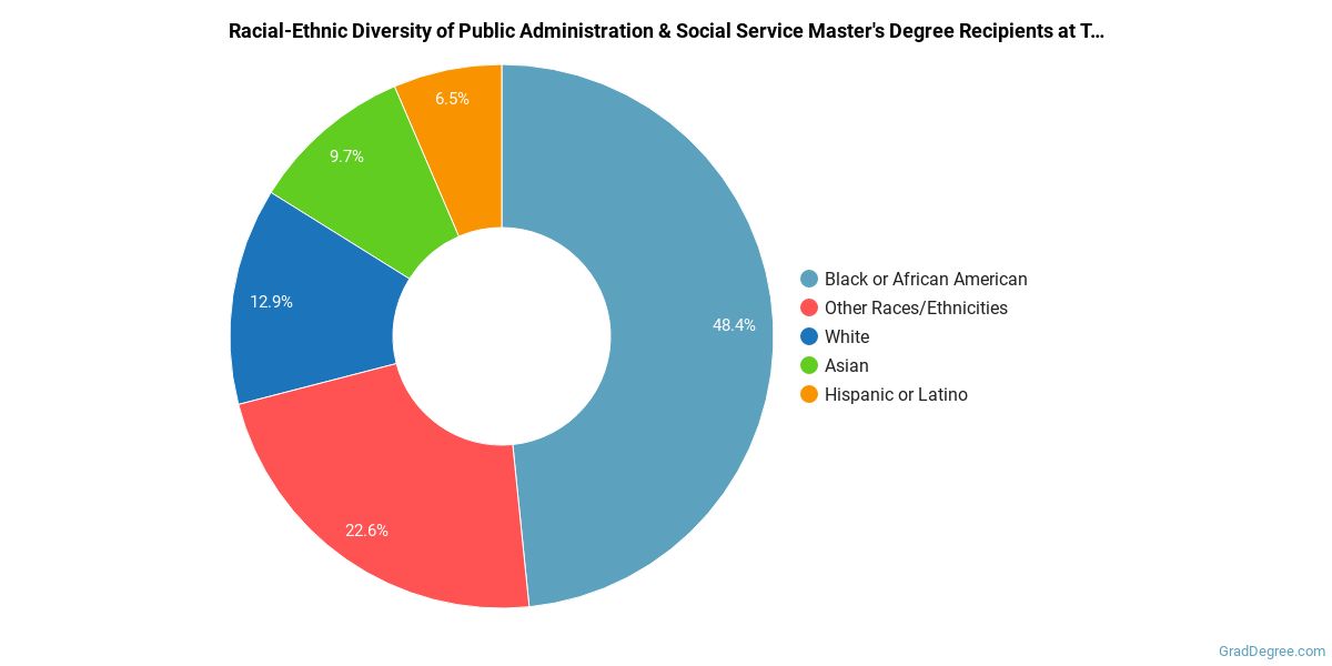 In the public administration and social service master's program at this school, racial-ethnic minorities make up 77% of degree recipients. That is 36% better than the national average.*