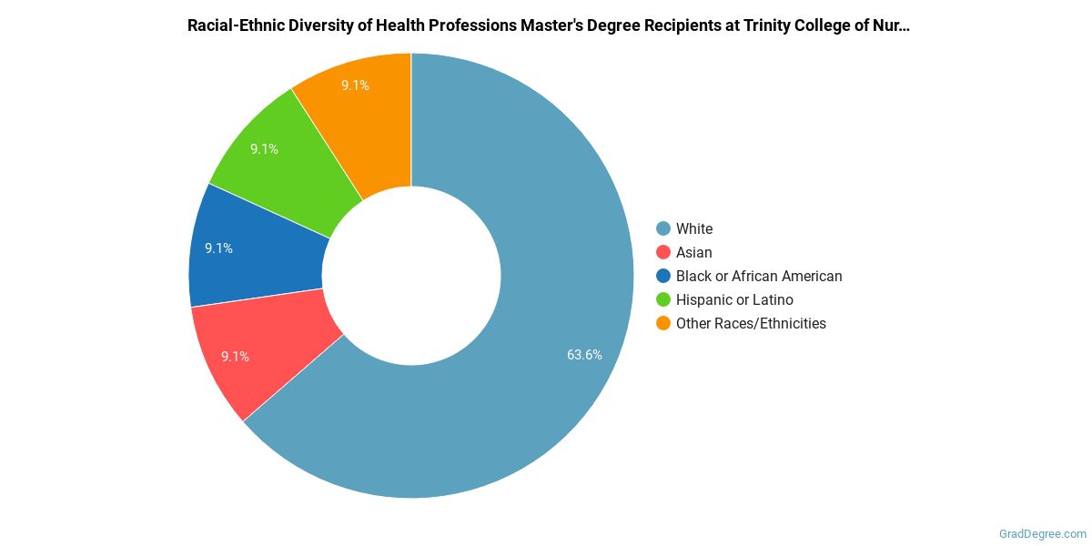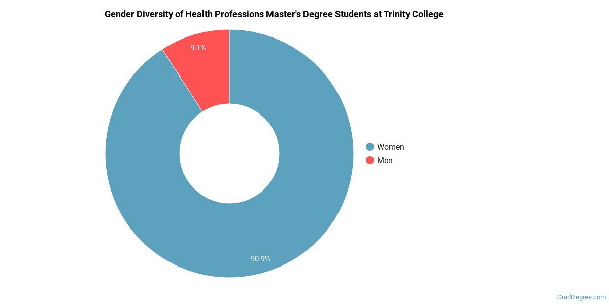 Of the students who received a health professions master's degree from Trinity College, 64% were white. This is above average for this degree on the natiowide level. In the health professions master's program at this school, racial-ethnic minorities make up 36% of degree recipients. That is 1% better than the national average.*