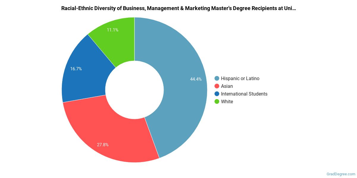 In the business, management and marketing master's program at this school, racial-ethnic minorities make up 72% of degree recipients. That is 40% better than the national average.*
