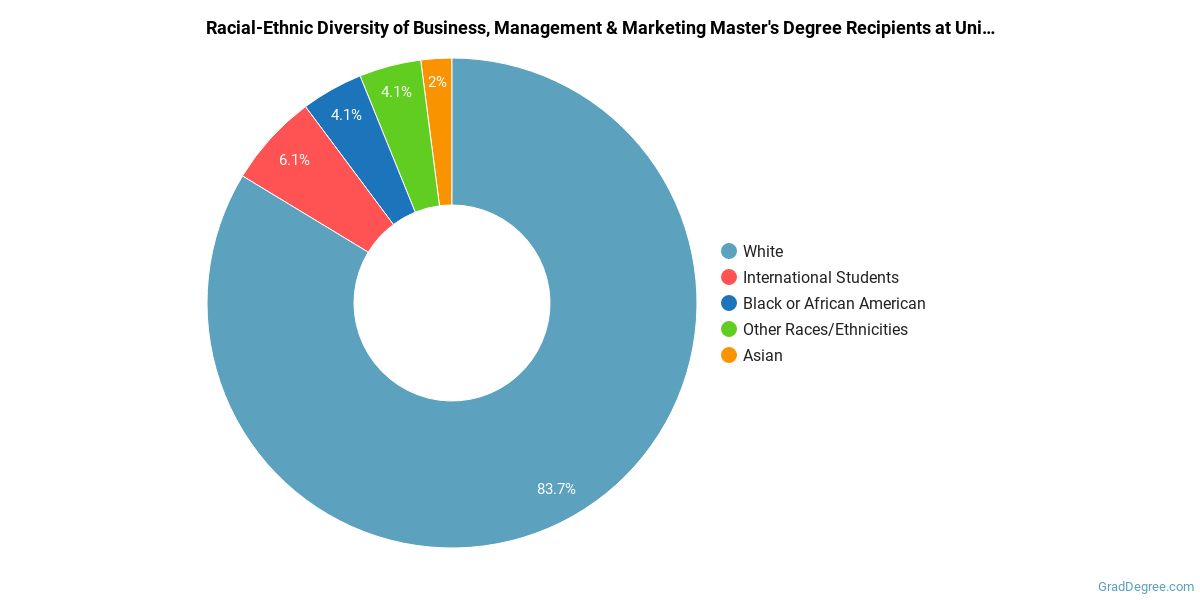 Of the students who received a business, management and marketing master's degree from UCM, 84% were white. This is above average for this degree on the natiowide level.