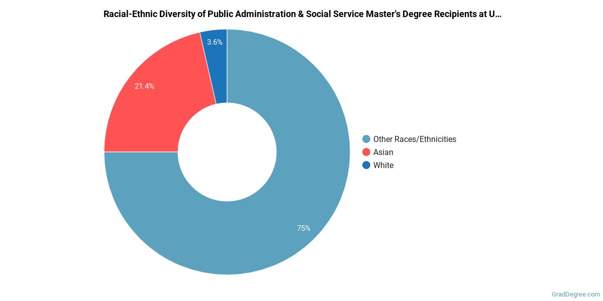 In the public administration and social service master's program at this school, racial-ethnic minorities make up 96% of degree recipients. That is 55% better than the national average.*