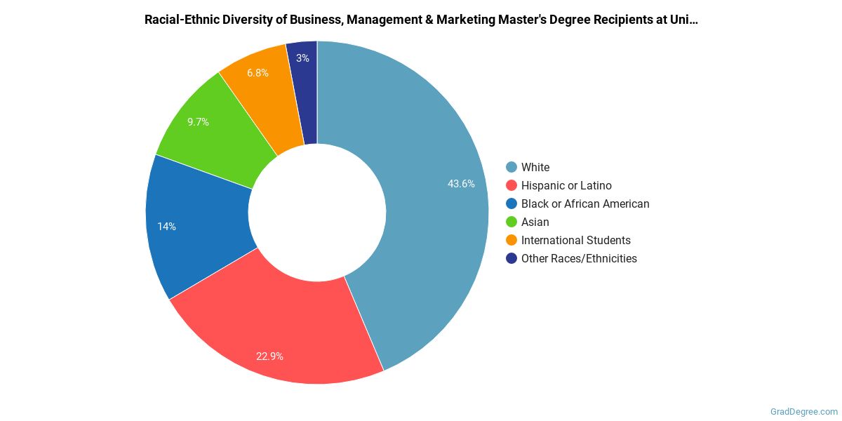 In the business, management and marketing master's program at this school, racial-ethnic minorities make up 49% of degree recipients. That is 17% better than the national average.*