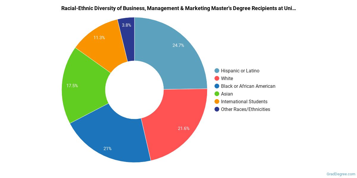 In the business, management and marketing master's program at this school, racial-ethnic minorities make up 66% of degree recipients. That is 34% better than the national average.*