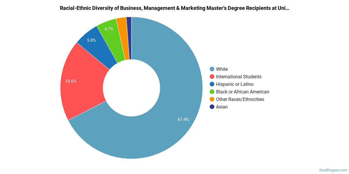 Of the students who received a business, management and marketing master's degree from UIndy, 67% were white. This is above average for this degree on the natiowide level.