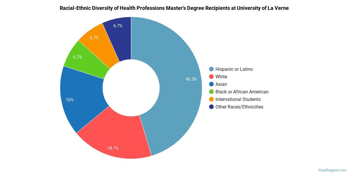 The following table and chart show the race/ethnicity for students who recently graduated from University of La Verne with a master's in health professions.