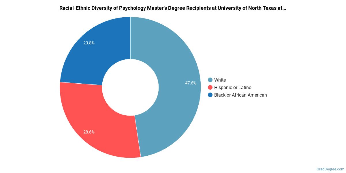 The following table and chart show the race/ethnicity for students who recently graduated from University of North Texas at Dallas with a master's in psychology.