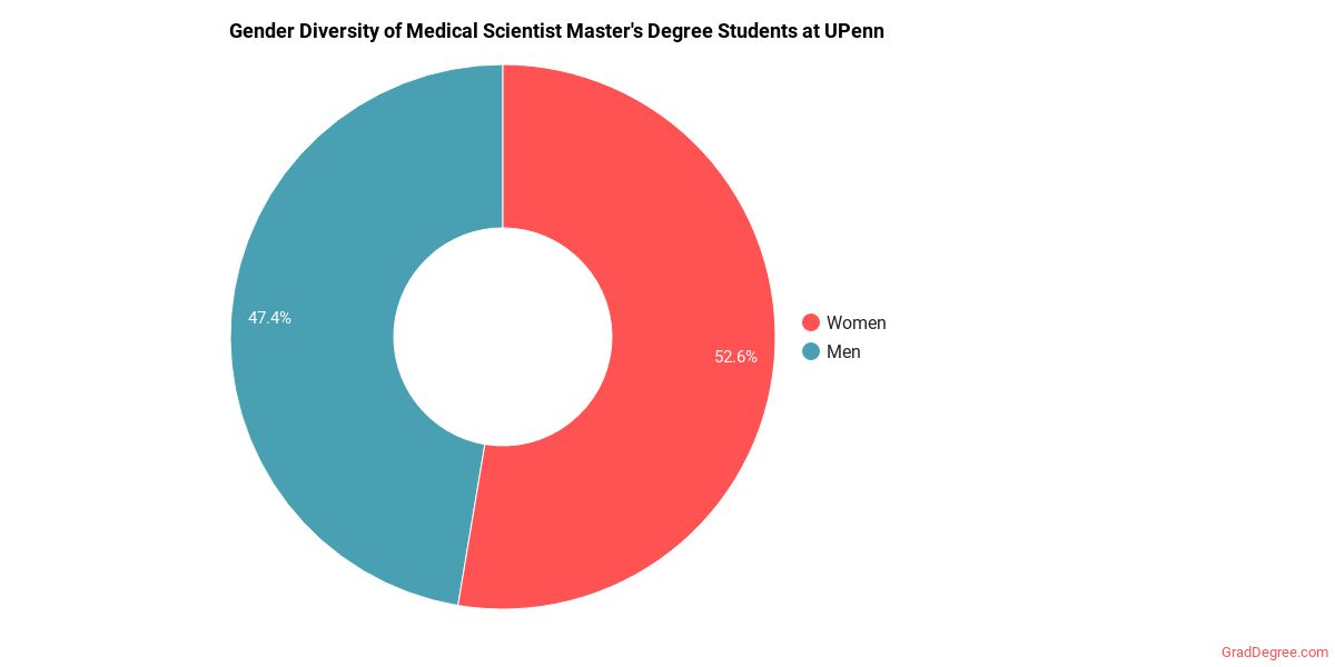 Of the students who received a medical scientist master's degree from UPenn, 52% were white. This is above average for this degree on the natiowide level. In the medical scientist master's program at this school, racial-ethnic minorities make up 43% of degree recipients. That is 3% better than the national average.*