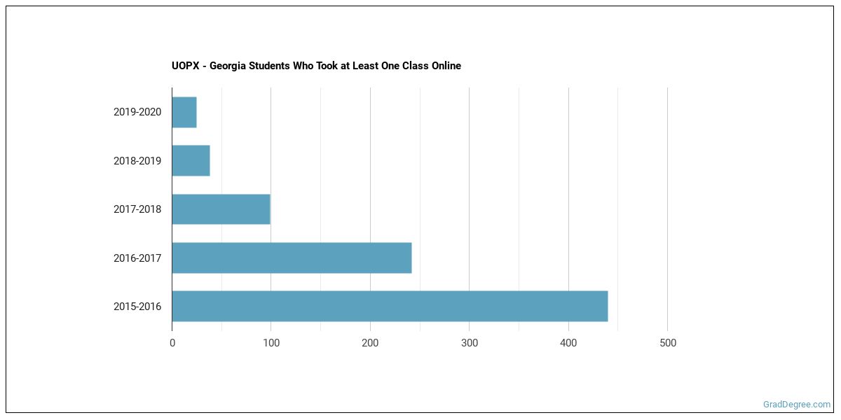 The average growth rate over the last four years of online students at University of Phoenix - Georgia was -46.9%. This is the #500 largest growth rate of all schools that are mostly online. This refers to all students at UOPX - Georgia regardless of major.