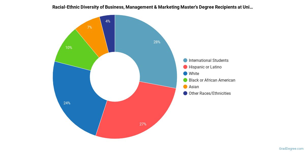 In the business, management and marketing master's program at this school, racial-ethnic minorities make up 45% of degree recipients. That is 13% better than the national average.*