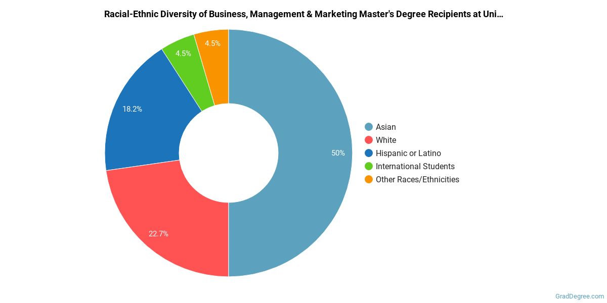 In the business, management and marketing master's program at this school, racial-ethnic minorities make up 73% of degree recipients. That is 41% better than the national average.*