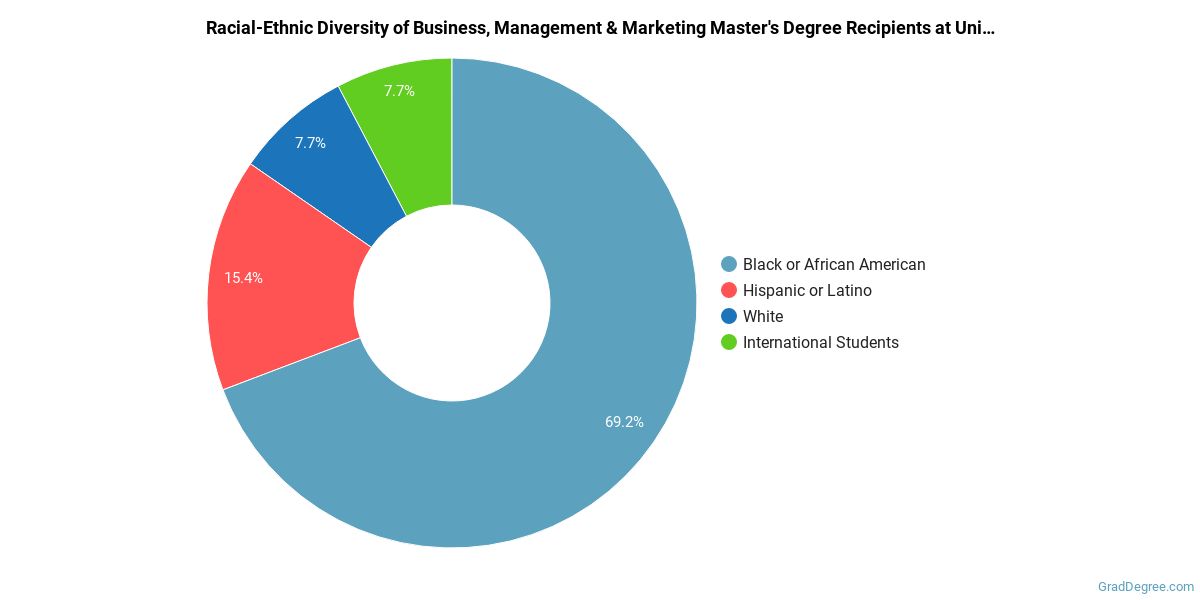 In the business, management and marketing master's program at this school, racial-ethnic minorities make up 85% of degree recipients. That is 53% better than the national average.*