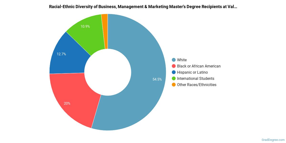 Of the students who received a business, management and marketing master's degree from VSU, 55% were white. This is above average for this degree on the natiowide level. In the business, management and marketing master's program at this school, racial-ethnic minorities make up 35% of degree recipients. That is 3% better than the national average.*