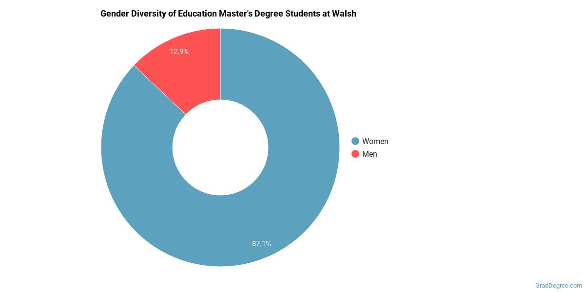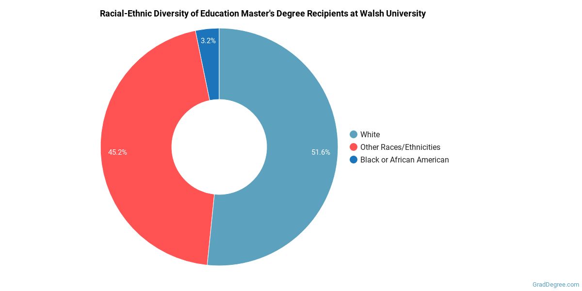 Of the students who received a education master's degree from Walsh, 52% were white. This is below average for this degree on the natiowide level.