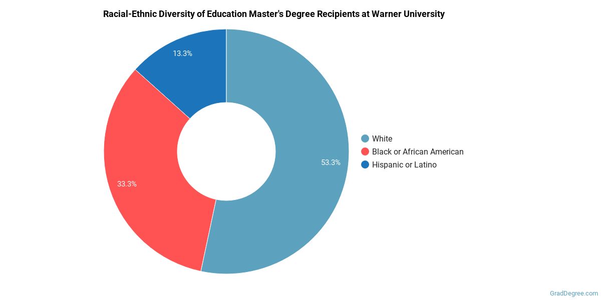 Of the students who received a education master's degree from Warner University, 53% were white. This is below average for this degree on the natiowide level. In the education master's program at this school, racial-ethnic minorities make up 47% of degree recipients. That is 17% better than the national average.*