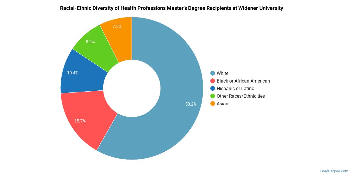 Of the students who received a health professions master's degree from Widener, 58% were white. This is typical for this degree on the natiowide level. In the health professions master's program at this school, racial-ethnic minorities make up 39% of degree recipients. That is 3% better than the national average.*