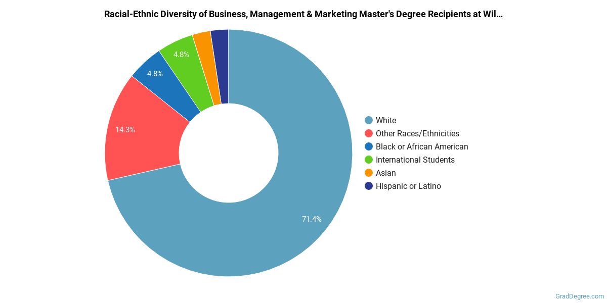 Of the students who received a business, management and marketing master's degree from Wilkes, 71% were white. This is above average for this degree on the natiowide level.