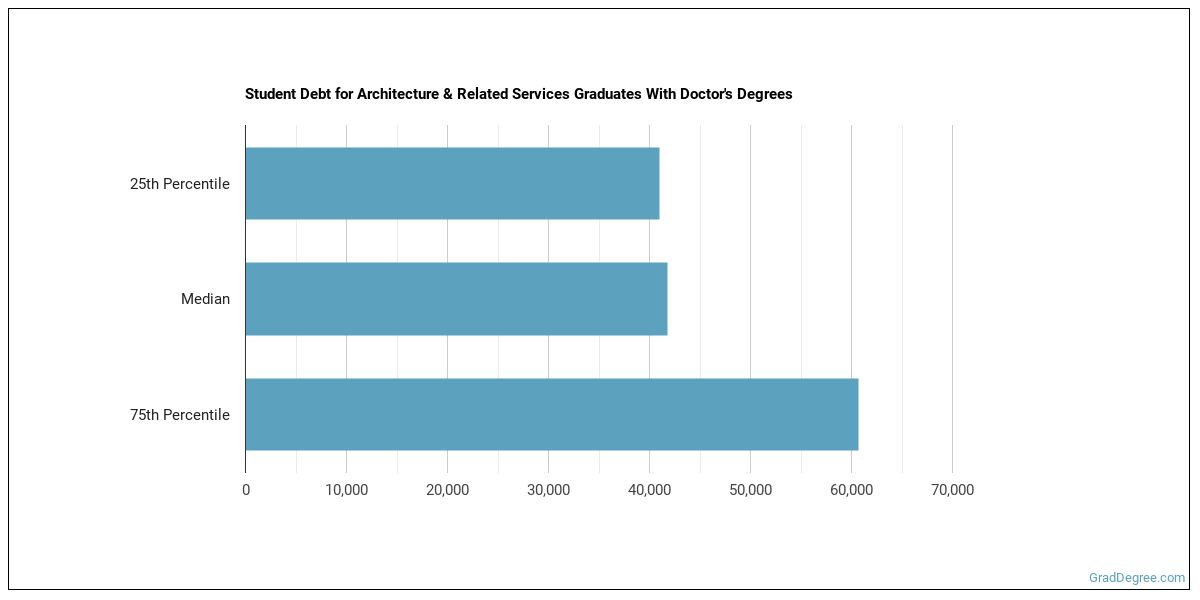 The median student debt for graduates holding a doctor's degree in architecture & related services is $47,023. The length of time it takes you to graduate and what college you attend can affect this number quite a bit. The chart below shows the range of accumulated debt loads. On the high side of the range, $80,761 is the debt load, and the debt load on the low side is $43,762.
