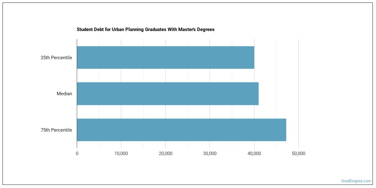 The median student debt for graduates holding a master's degree in urban planning is $41,000. The school you go to and how long it takes you to graduate, among other things, can cause this number to vary. The chart below shows the range of accumulated debt loads. On the high side of the range, $48,466 is the debt load, and the debt load on the low side is $37,329.