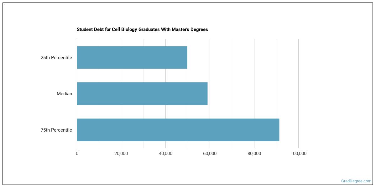 The median student debt for graduates holding a master's degree in cell biology is $61,426. The school you go to and how long it takes you to graduate, among other things, can cause this number to vary. The chart below shows the range of accumulated debt loads. On the high side of the range, $69,814 is the debt load, and the debt load on the low side is $55,241.
