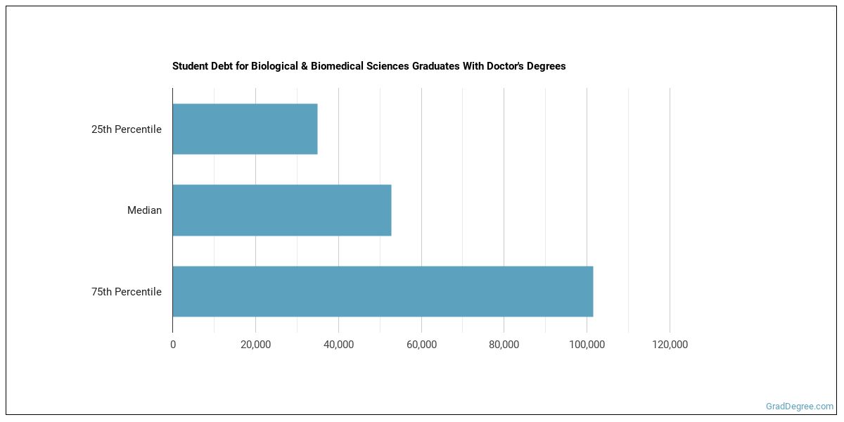 The median student debt for graduates holding a doctor's degree in biological & biomedical sciences is $43,008. The length of time it takes you to graduate and what college you attend can affect this number quite a bit. The chart below shows the range of accumulated debt loads. On the high side of the range, $43,623 is the debt load, and the debt load on the low side is $38,754.