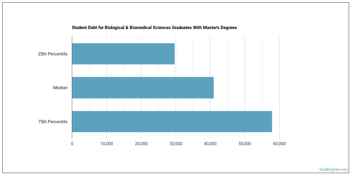 The median student debt for graduates holding a master's degree in biological & biomedical sciences is $41,000. The school you go to and how long it takes you to graduate, among other things, can cause this number to vary. The chart below shows the range of accumulated debt loads. On the high side of the range, $57,629 is the debt load, and the debt load on the low side is $30,778.