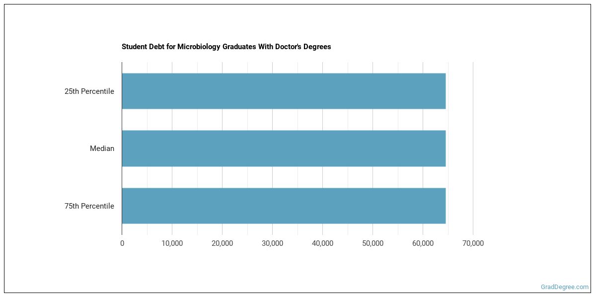 The median student debt for graduates holding a doctor's degree in microbiology is $44,238. The school you go to and how long it takes you to graduate, among other things, can cause this number to vary. The chart below shows the range of accumulated debt loads. On the high side of the range, $44,238 is the debt load, and the debt load on the low side is $44,238.
