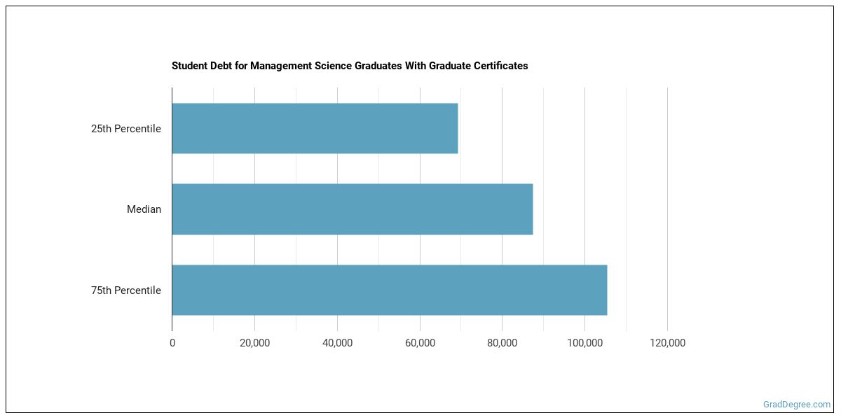 The median student debt for graduates holding a graduate certificate in management science is $34,045. The length of time it takes you to graduate and what college you attend can affect this number quite a bit. The chart below shows the range of accumulated debt loads. On the high side of the range, $35,890 is the debt load, and the debt load on the low side is $33,007.