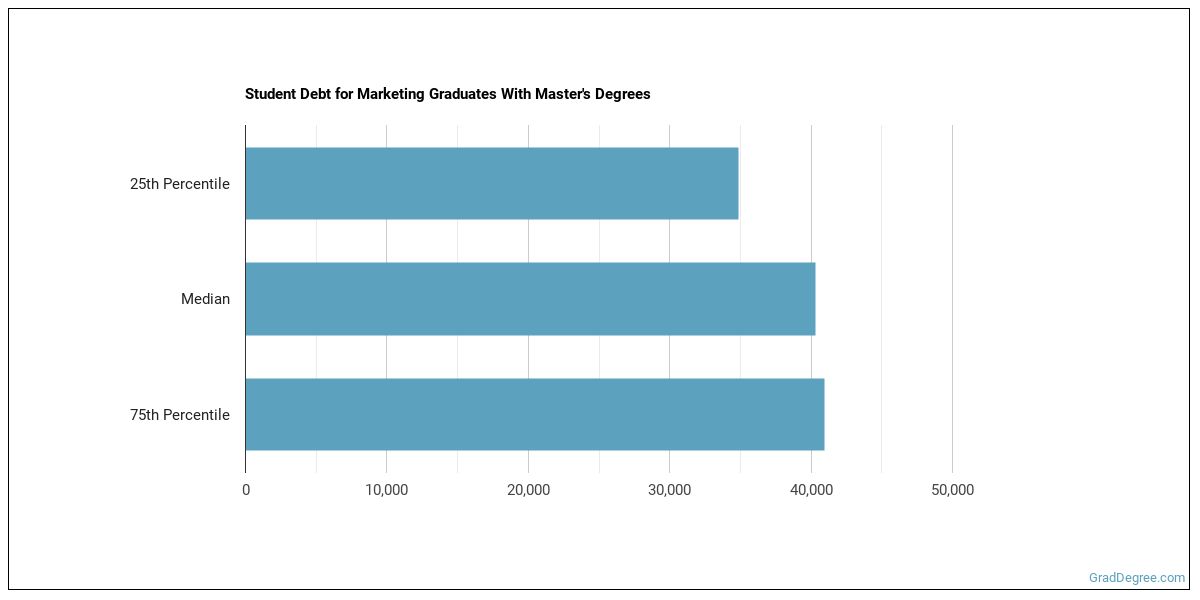 The median student debt for graduates holding a master's degree in marketing is $40,705. The school you go to and how long it takes you to graduate, among other things, can cause this number to vary. The chart below shows the range of accumulated debt loads. On the high side of the range, $40,853 is the debt load, and the debt load on the low side is $34,166.