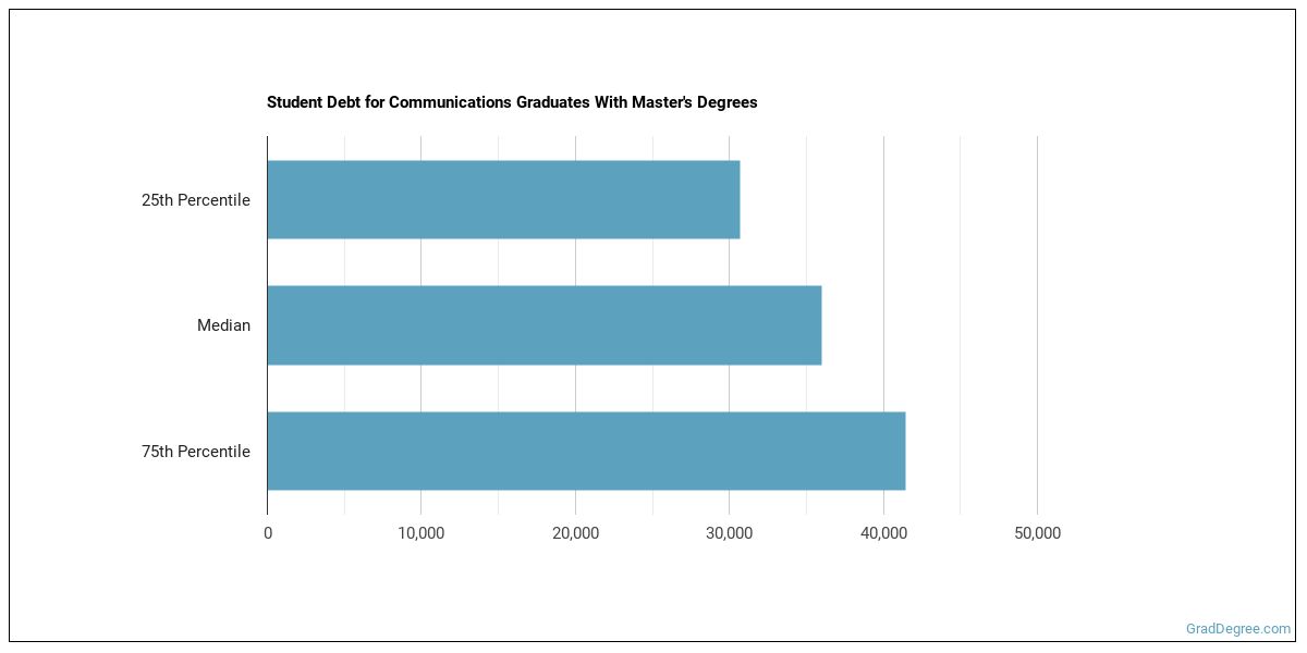 The median student debt for graduates holding a master's degree in communications is $34,167. The length of time it takes you to graduate and what college you attend can affect this number quite a bit. The chart below shows the range of accumulated debt loads. On the high side of the range, $47,481 is the debt load, and the debt load on the low side is $29,671.