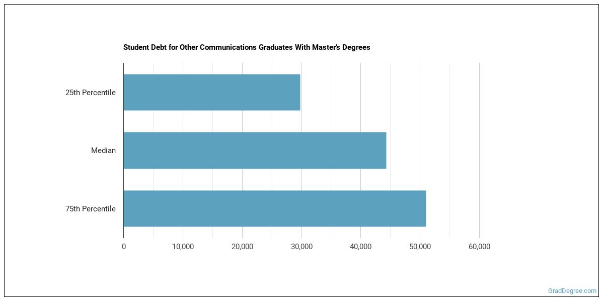The median student debt for graduates holding a master's degree in other communications is $53,941. The length of time it takes you to graduate and what college you attend can affect this number quite a bit. The chart below shows the range of accumulated debt loads. On the high side of the range, $79,316 is the debt load, and the debt load on the low side is $38,647.