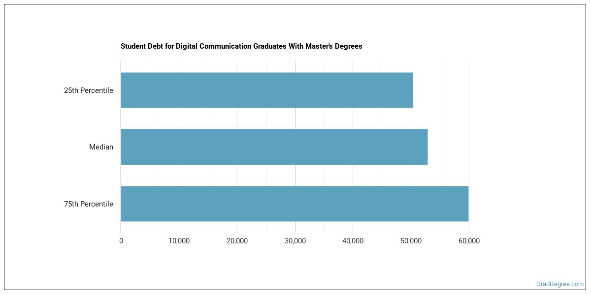 The median student debt for graduates holding a master's degree in digital communication is $44,559. The length of time it takes you to graduate and what college you attend can affect this number quite a bit. The chart below shows the range of accumulated debt loads. On the high side of the range, $58,814 is the debt load, and the debt load on the low side is $33,381.